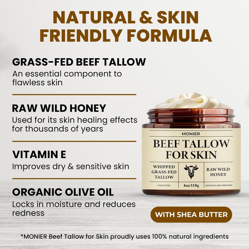 MONIER Whipped Beef Tallow for Skin, Tallow and Honey Balm for Face, Moisturizer with 100% Organic Grass-Fed Beef Tallow & Raw Wild Honey - Natural Formula for Dry & Sensitive Skin (Unscented)