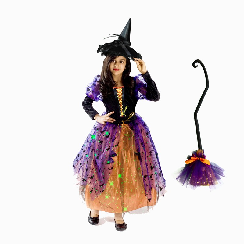 MONIKA FASHION WORLD Witch costume for girls with BROOM, black hat skirt lights up (Medium (6-8))