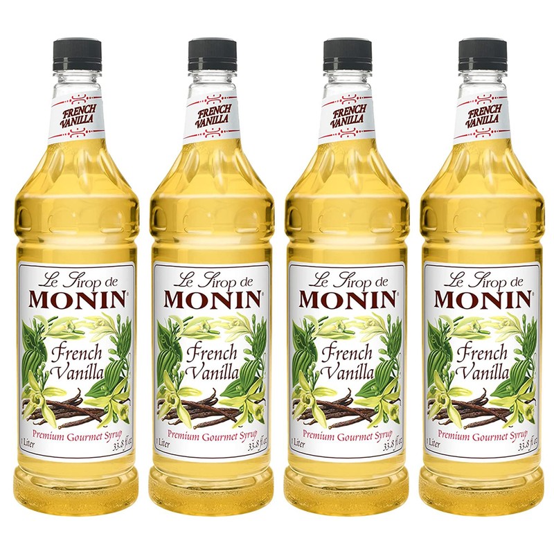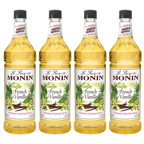Monin - French Vanilla Syrup with Monin BPA Free Pump, Boxed, Versatile Flavor, Natural Flavors, Great for Coffees, Cocktails, Shakes, and Kids Drinks, Non-GMO, Gluten-Free (1 Liter, 4-Pack)