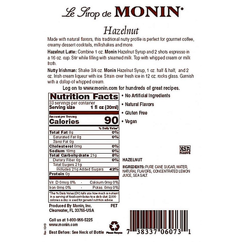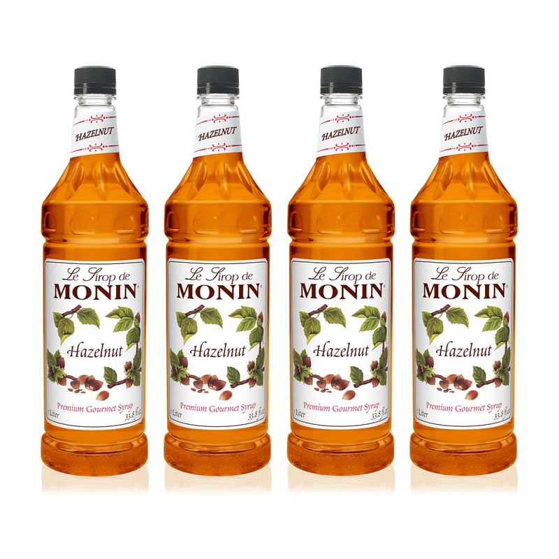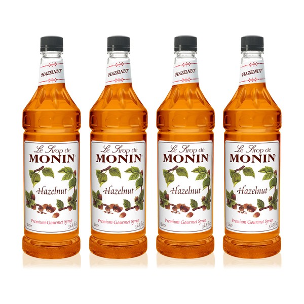 Monin - Hazelnut Syrup, Nutty Taste of Caramelized Hazelnut, Natural Flavors, Great for Mochas, Lattes, Smoothies, Shakes, and Cocktails, Non-GMO, Gluten-Free (1 Liter, 4-Pack)