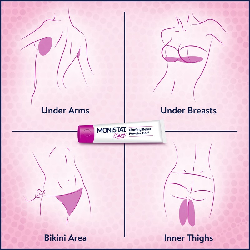 - Safe to use under arms, under breasts, on the bikini area, and on inner thighs; fight chub rub and shaving irritation alike with Monistats soothing anti-chafing gel