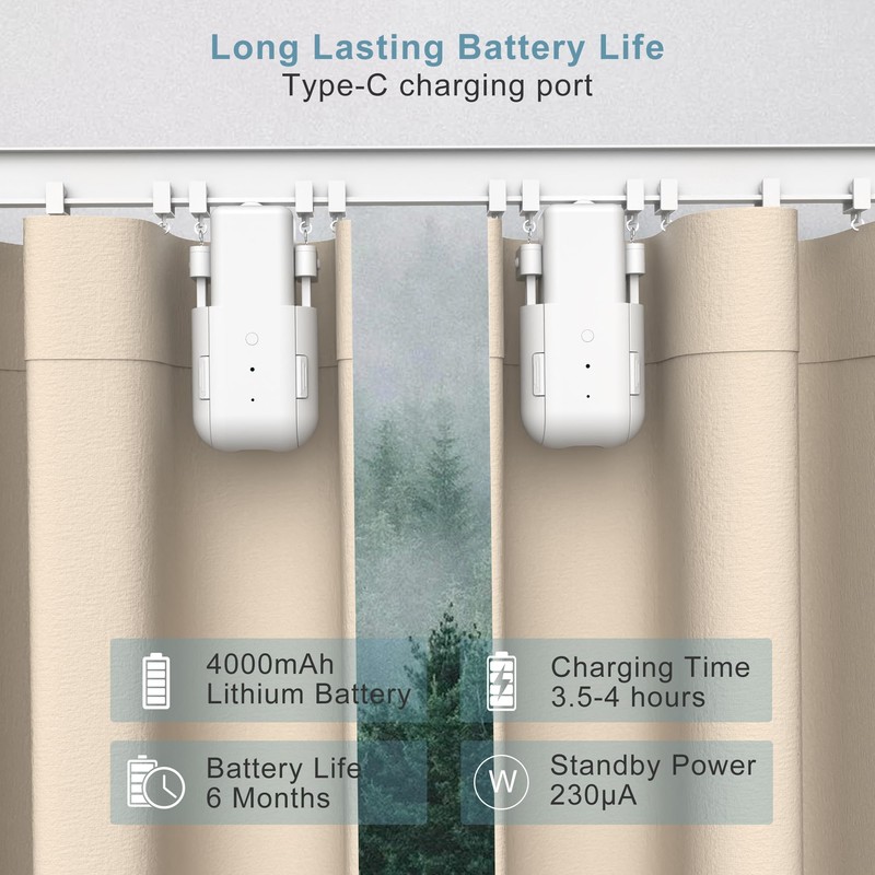 - 20kg Heavy-Duty Motor & 6-Month Battery Life: Powered by a 20W electric curtain motor with 20kg torque, this smart electric curtain robot effortlessly drives heavy blackout curtains or multi-layer drapes in hotel rooms or commercial storefront windows. The built-in 4000mAh lithium rechargeable battery(one unit) supports over 6 months of daily use on a single charge via the Type-C port (3.5-4 hours charging time). The upgraded motor ensures stable performance while maintaining ultra-low standby power consumption for automatic open-close electric curtain systems