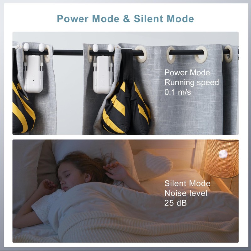 Note: This product does NOT support Wi-Fi or voice assistants like Alexa - Dual Silent/Power Mode Operation: Switch between automatic curtain opener and closer modes via the remote: Silent Mode (25dB noise level) ensures quiet operation for smart nursery windows or hospital rooms, while Power Mode (0.1m/s speed) handles heavy curtains in retail window displays. To toggle modes, press and hold "Open+Stop" for 3 seconds (Power) or "Close+Stop" (Silent). Mode changes are disabled during DIY motorized window track operation