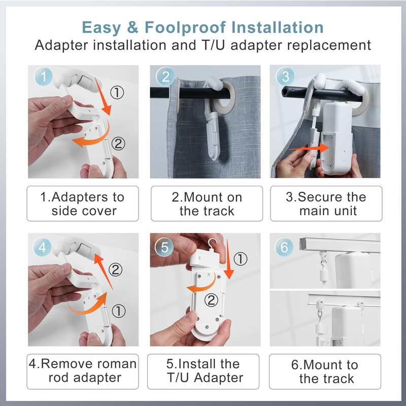 - Multi-Track Compatibility: This automatic curtain opener system supports three mainstream motorized curtain tracks: Roman rods (8-40mm diameter), T-track, and U-track systems, including indoor/outdoor automatic curtains for horizontal windows. The package includes 2 sets of T/U adapters (4 pieces) and 2 sets of Roman rod adapters (4 pieces) for effortless no-drill no-touch electronic curtain installation in smart bedroom windows, office or stage drapery control systems Note: Measure your existing curtain rod diameter and window dimensions before purchasing to ensure compatibility with motorized curtain rods for windows