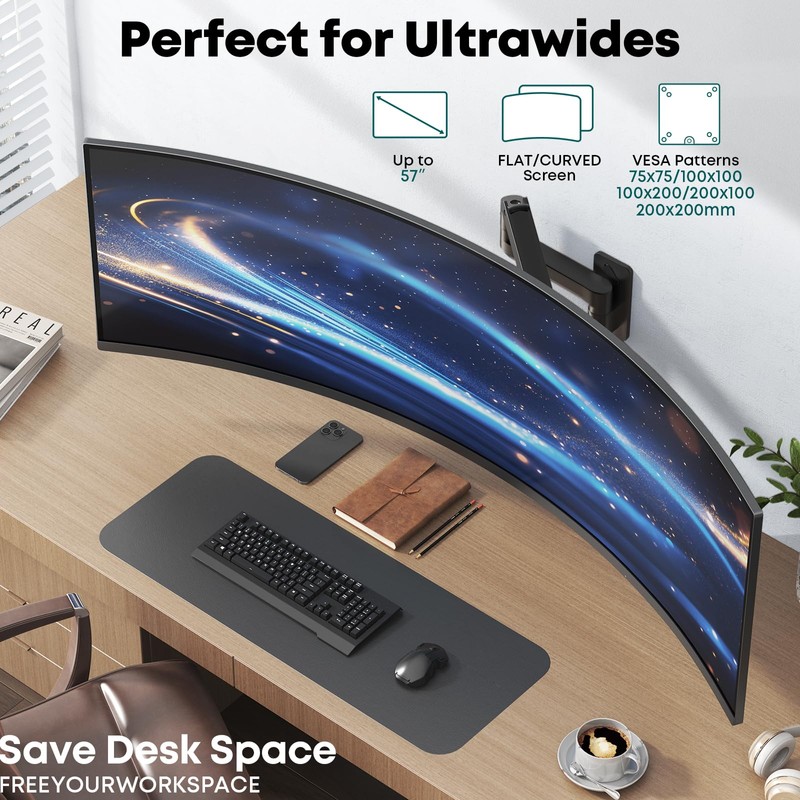- Wide Compatibility for 17"-57" Monitors: This heavy-duty wall mount monitor arm fits most 17 to 57 inch flat or curved monitors. Supports VESA patterns 75x75, 100x100, 200x100, and 200x200mm. Compatible with popular screen sizes including 57", 49", 45", 43", 32", 27", 24", 21", 19", 17", and more