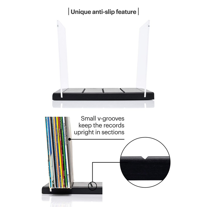 • NO MORE SLIDING: An intelligent V-groove design keeps your records up-right in sections