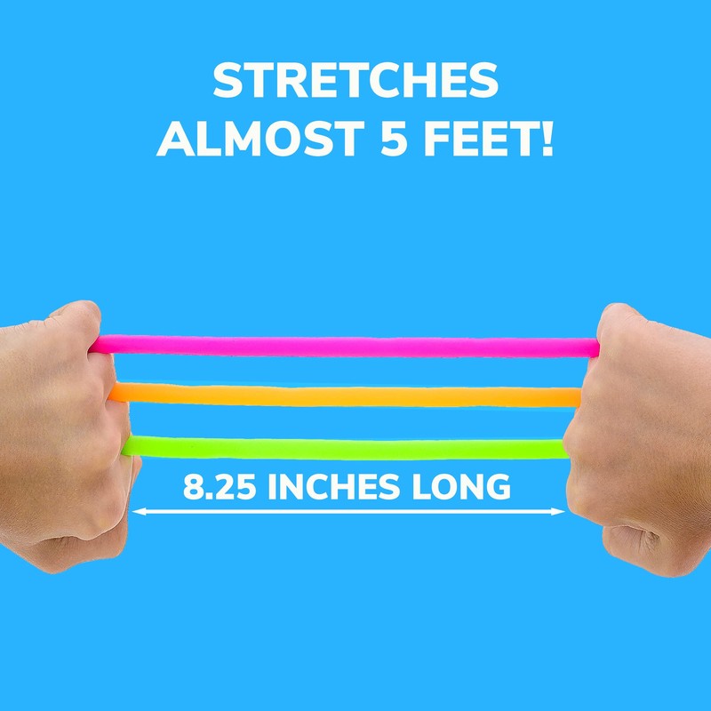 - These monkey noodle fidget toys are 8.25" long and 0.3" thick, but are able to stretch almost 5 feet! Stretchy noodles are great gifts for classroom kids Christmas and come in 7 neon colors: yellow, orange, coral, purple, green, blue and pink
