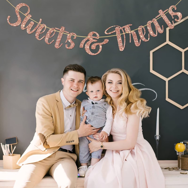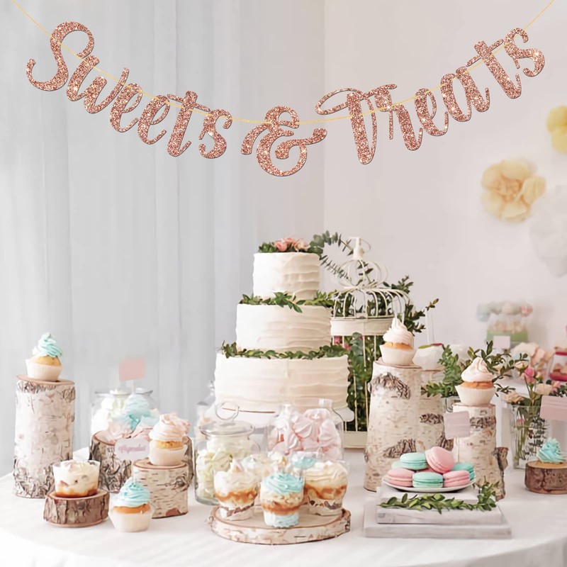 MonMon & Craft Sweets & Treats Banner/Bridal Shower/Engagement/Girls Birthday Party Decor/Bachelorette/Wedding Party Decorations Rose Gold Glitter