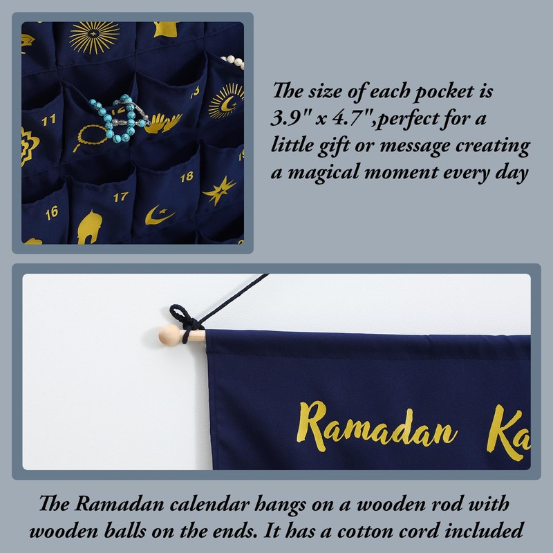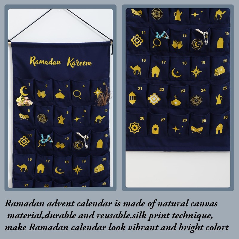 • Reusable Ramadan Advent Calendar:Our classic canvas fabric Ramadan calendar is the perfect way to count down the days and make wonderful memories during the Holiday season. This calendar will be part of your family Ramadan traditions, and you will be able to use it year after year.Our Ramadan calendar can be used as a storage bag to hang on the wall or the door, is perfect for storing some everyday household items
