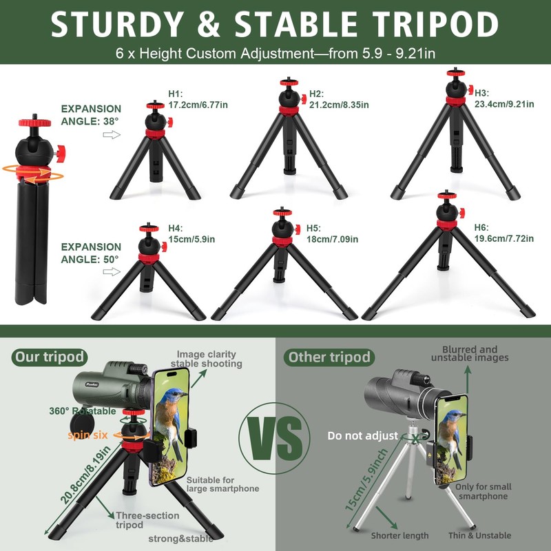 - 【Package Accessories Includes】1x Monocular -1x Smartphone Holder -1x Upgrade Tripod -1x Velvet Bag -1x Dust cover -1x Cleaning Cloth -1x Straps -1x User Manual.
