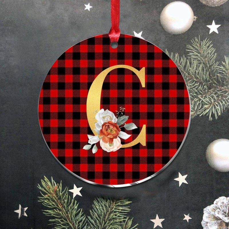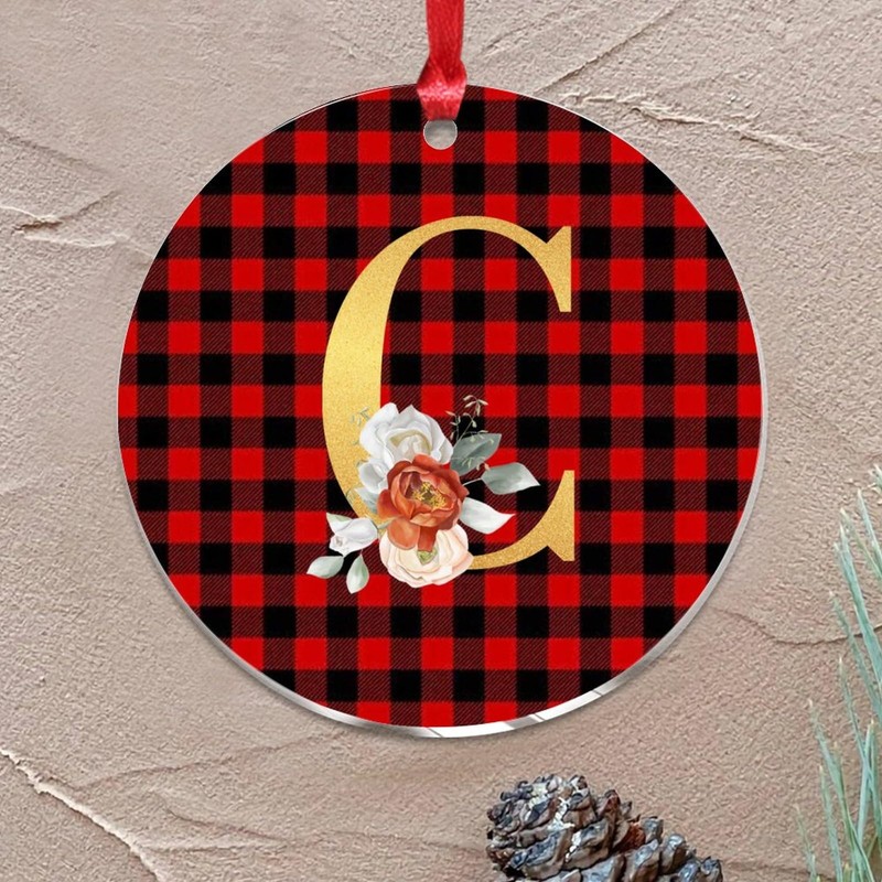 Monogram Gold Glitter Initial Letter C Xmas Ornament Flowers Pattern Blossom Roses Round Christmas Tree Ornament Keepsake Flowers Bouquet Wildflowers Acrylic Christmas Bauble for Holidays Home Decor