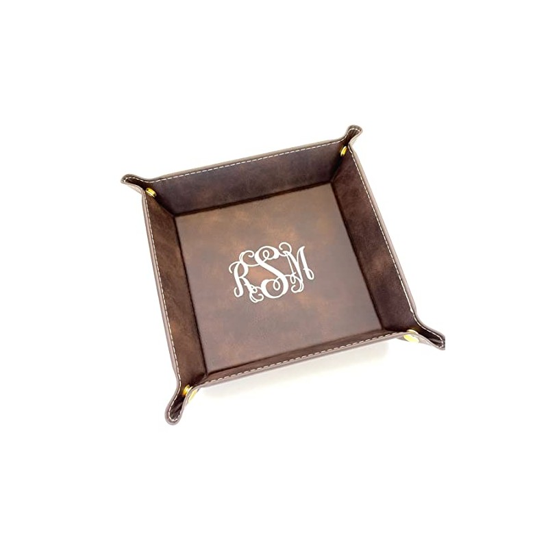 Personalized valet tray makes a great gift. We will permanently laser engrave the tray with a monogram in your style choice. For the monogram initials should be in First, Last, Middle order. The faux leather tray comes in three colors, black with silver monogram, pink with black and rustic brown with gold. Faux leather material wipes clean easily with damp cloth. 8" x 8" snap corners