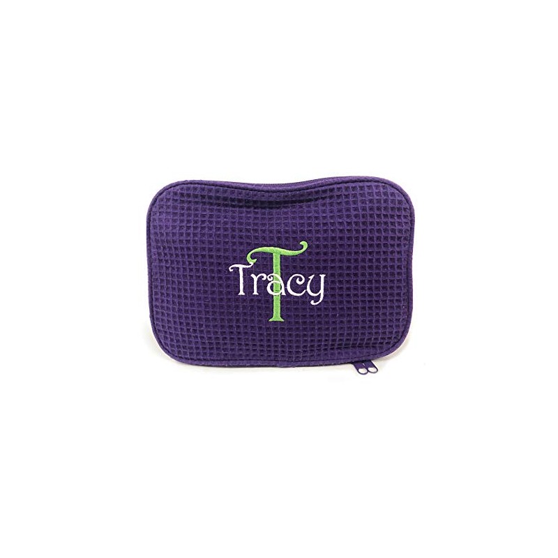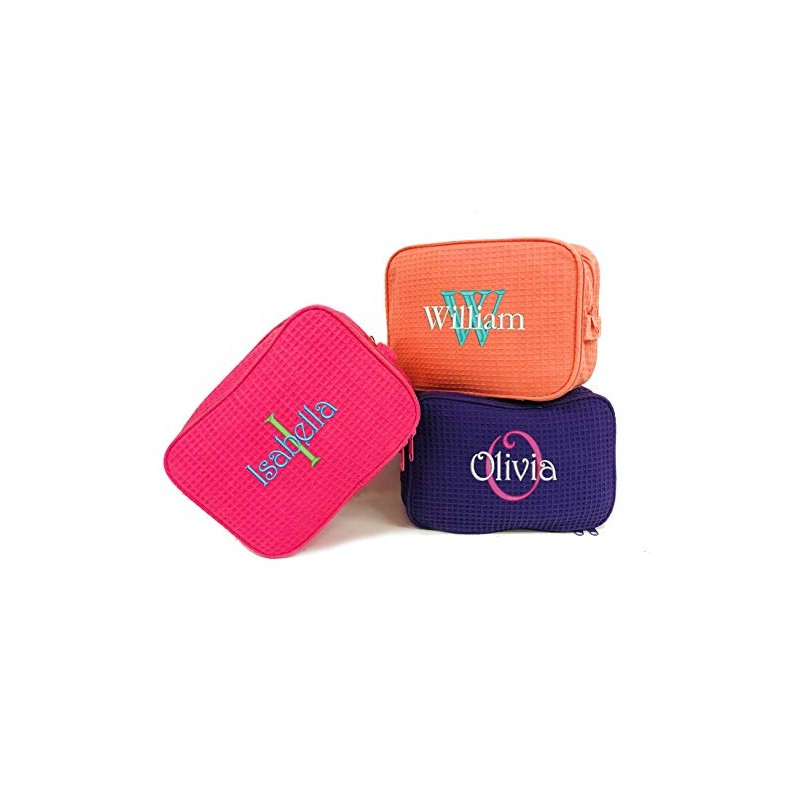 Get packing for your next trip with this stylish and functional personalized cosmetic bag. Your little one will LOVE seeing their name spelled out on their very own bag. Our waffle weave cosmetic bag is stylish and functional. This personalized cosmetic bag makes a wonderful personalized gift. Great for travel, and for every day. Two separate zippered compartments with . Made of 60% cotton / 40% polyester waffle weave fabric. Made of cotton with a water-resistant lining, it is durable enough to carry beauty products, makeup, art supplies, medicine, and all travel necessities. Bag comes monogrammed with first name AND initial. Please choose the thread color for the name from the drop down menu and enter the color of your initial in the personalization box along with the name. If you do not indicate the color you would like for your initial, we will use white since it is most popular. :)