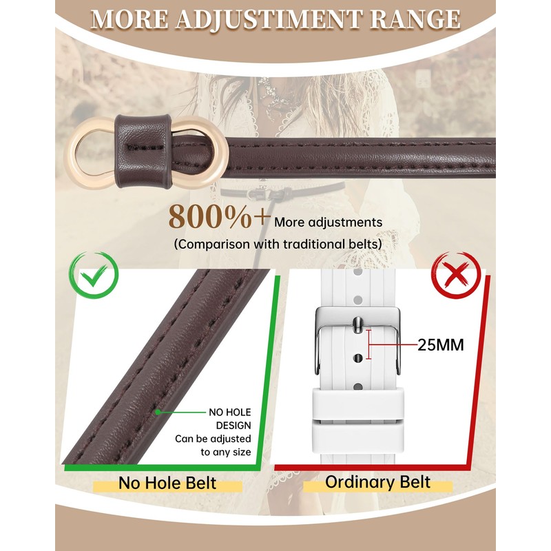 - No-Hole Adjustable Belts for Dresses & Jeans: Smooth sliding buckle creates a thin waist belt that perfectly fits dresses, jeans, or coats without visible holes