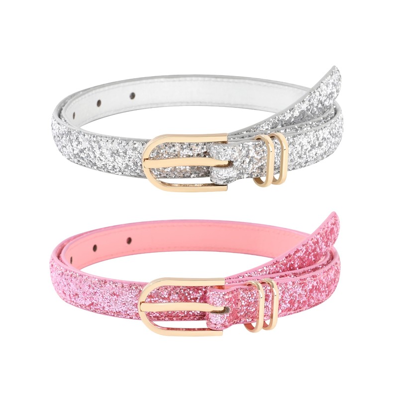 Monopa Kids Leather Belts for Girls - 2 Pack Toddler Girls Skinny Leather Belts for Jeans with Gold Buckle (Sequin Silver+Sequin Pink,80cm)