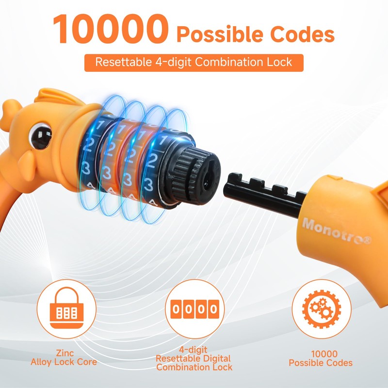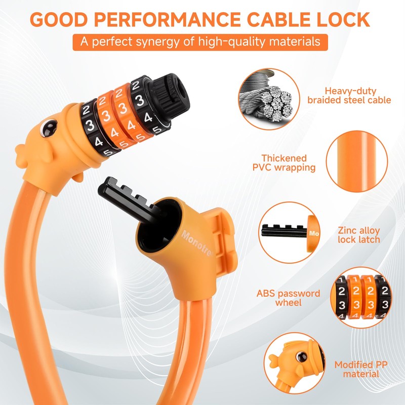 Monotre Bike Lock, 3.9 Feet 4-Digit Resettable Combination Password Anti-Theft Cable Lock, Cute Coiled Bike Lock with Mounting Bracket, Suitable for Bicycles, Electric Scooters, Ebikes (Orange-12mm)