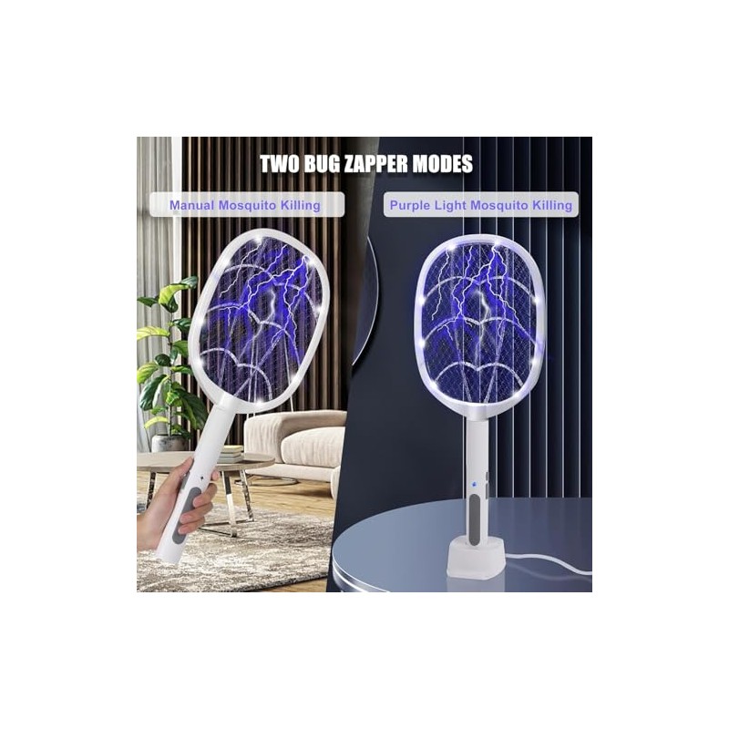 - Dual Mode for Flexibility: Features both Handheld and Auto Modes. In Handheld Mode, manually zap insects. In Auto Mode, the swatter attracts mosquitoes using UV light and can stand upright for hands-free use, perfect for night-time operation