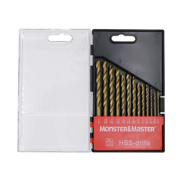 Monster & Master Titanium Plated Drill Bit Set, 13-Piece, High-Speed Steel Gold Drill Bits with 135 Degree Split Point Tip, 1/16" to 1/4", MM-TP-001