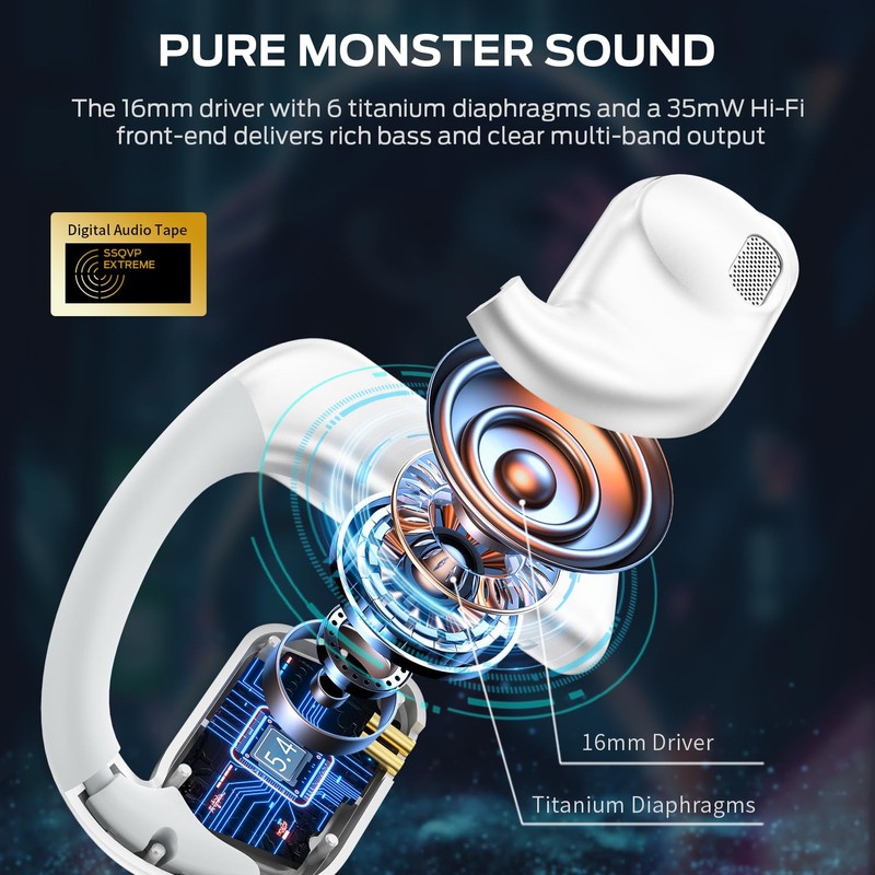 - Pure Monster Sound - Experience the impressive audio performance of the Monster Open Ear AC210 headphones. Featuring advanced Monster HiFi sound technology, these open ear headphones deliver rich, dynamic sound with deep bass and crystal-clear highs. Enjoy your favorite music, podcasts, and calls with exceptional clarity and detail. Whether you are at home or on the go, these open earbuds promise an immersive listening experience that you won't want to miss.