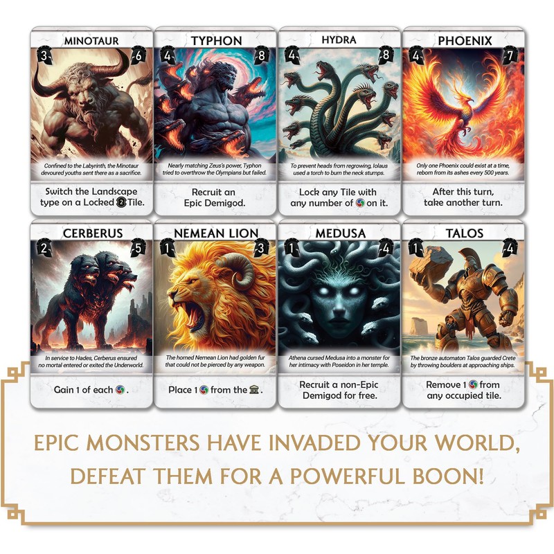 - MONSTERS EXPANSION: Mythical Monsters have invaded the newly formed Landscapes. Use new Demigods to gather an army of Hoplites to drive them off your land or defeat them for a powerful boon.