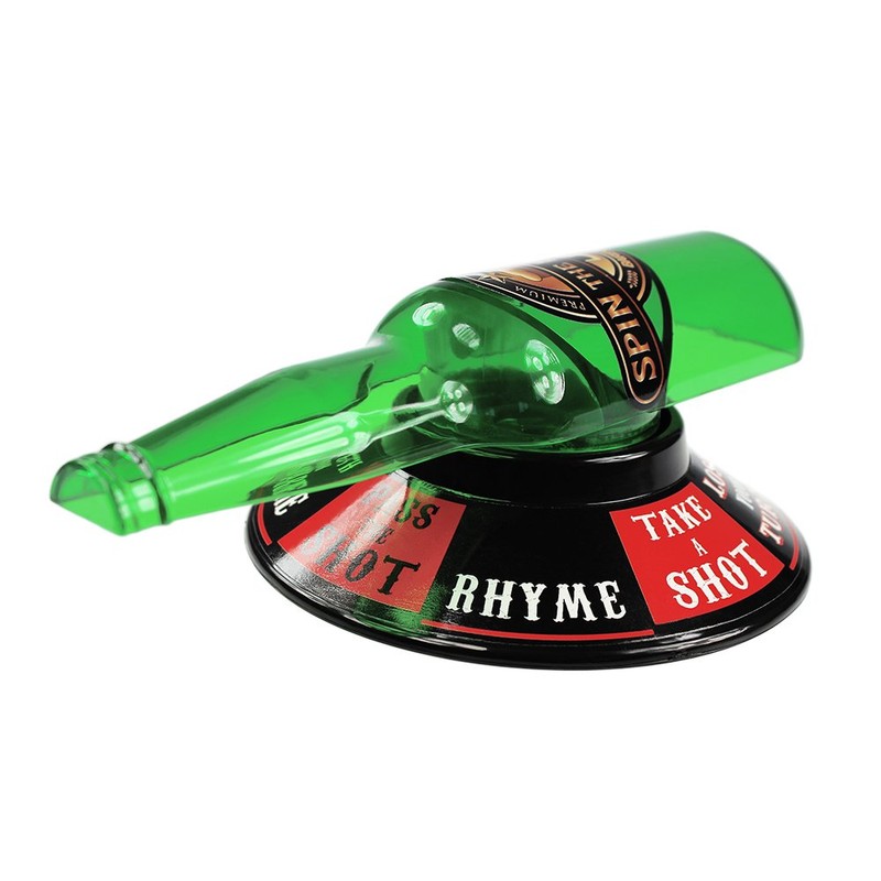 Spin the bottle is the perfect party game, because it does not matter whether the guests know each other well or not: what is better to get to know each other than a round of bottle turns? A small, green bottle stays on one of eight task fields that have quite harmless things in hand, such as saying a few rhymes - but there may also be a round of shots for everyone! The bottle turning game - Spin the bottle is suitable as a board game as well as a drinking game - simply perfect for the next celebration!