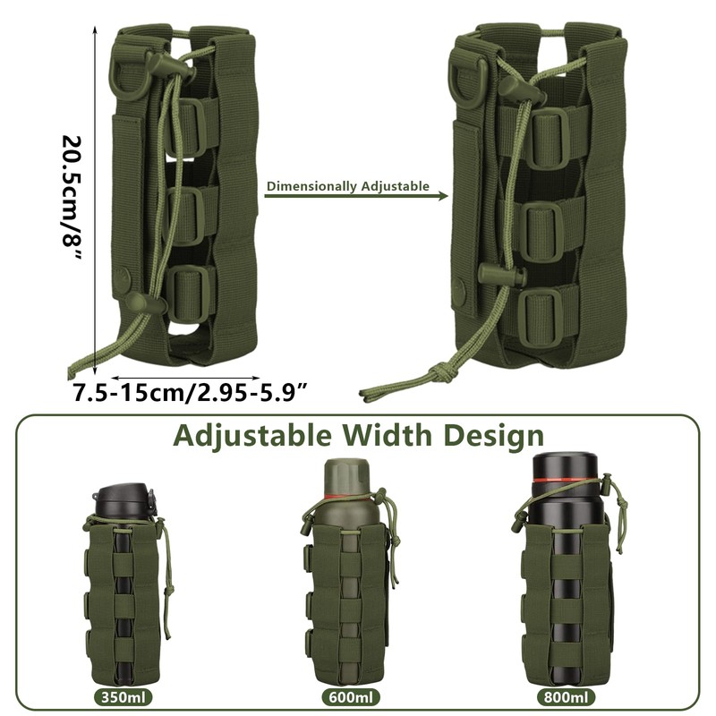 - Easy to use: tactical bottle holder with two side buckle straps, it can be used as an additional external bag for attaching to tactical backpacks, combat vests, belts or other tactical devices. The two D-rings are designed to hang or hang on the carabiner.