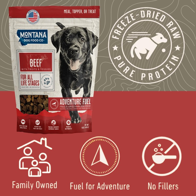 MONTANA DOG FOOD CO. Freeze-Dried Raw Beef Recipe Dog Food – Grain-Free, High-Protein Meal or Topper, Made in USA with USA Ingredients (16 oz Bag)