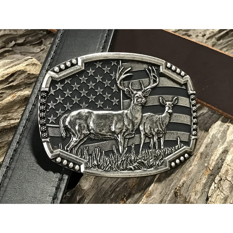 • BUCK AND DOE: Deer Standing In a Grassy Field with an America Flag Background Give This Antiqued Silver Tone Buckle An Eye-Catching Appearance