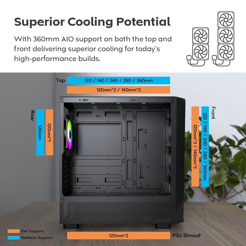 - Pre-installed ARGB fans: Comes build-ready with three 140mm front ARGB fans and one 120mm rear ARGB fan, delivering vibrant lighting and efficient airflow out of the box.