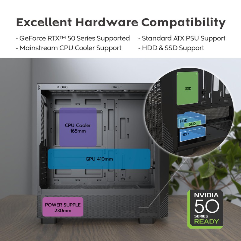 - Latest GPU Support: With an enlarged internal capacity, the case supports GPUs up to 410mm in length. Ready for the latest RTX 50 Series and other high-performance graphics cards.