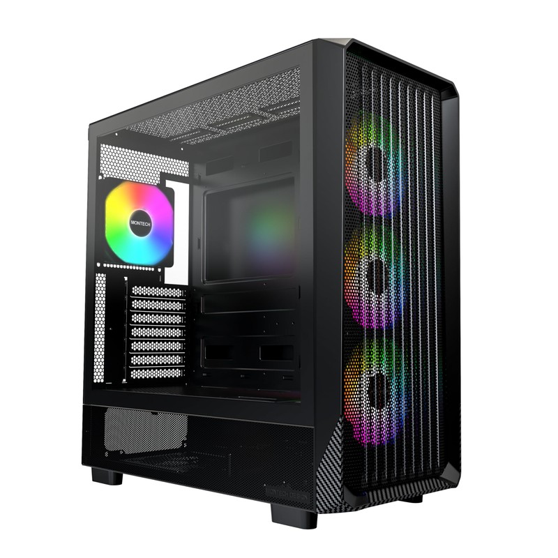 Montech X5- ATX Mid-Tower Gaming PC Case, High Airflow, 3X 140mm and 1x 120mm ARGB Fans Pre-Installed, Glass Side Panel, Carbon Print Accents, GPU Holder Included, Black