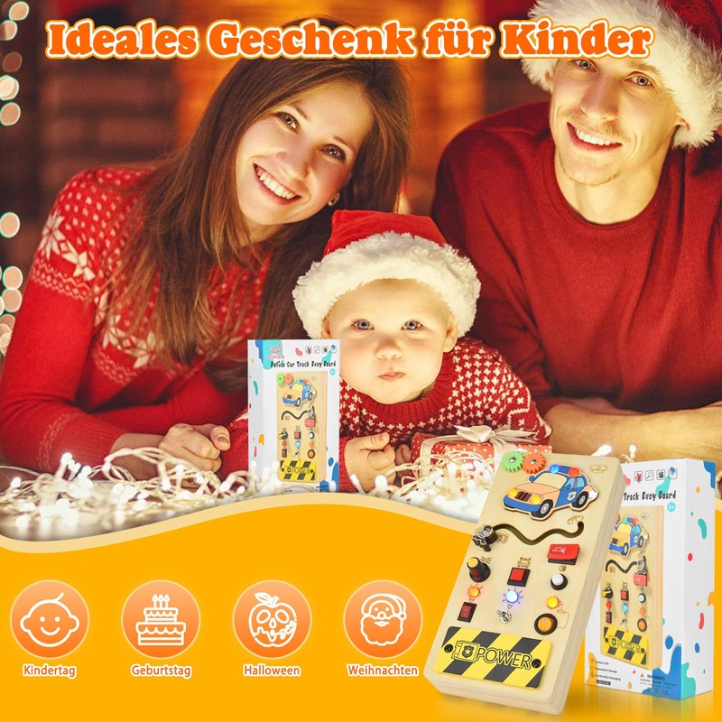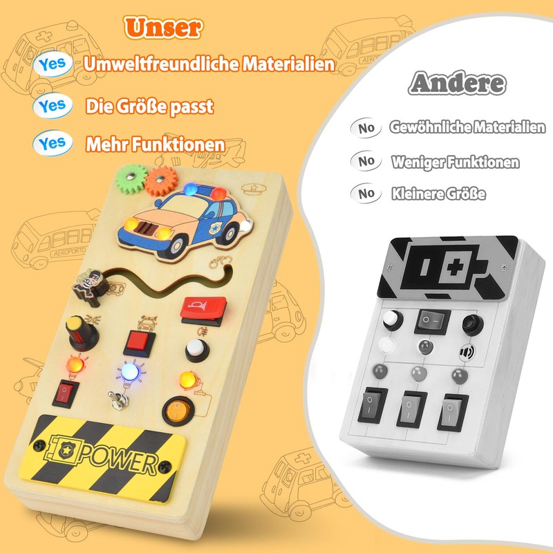 - Light up busy board: luminous switch board toy contains lights in different colours and sizes + 8 buttons, requires 2 AAA batteries (not included).