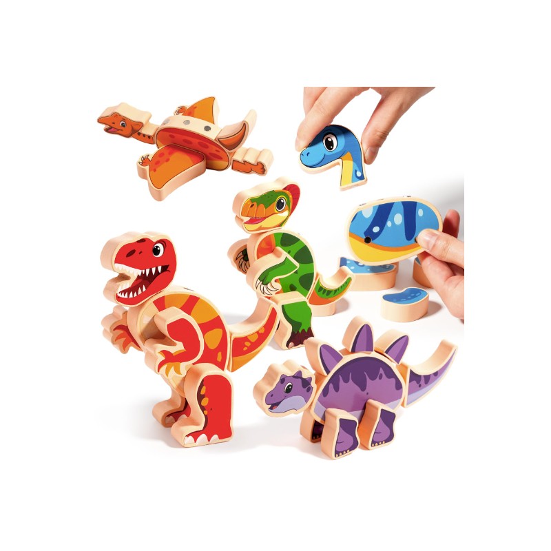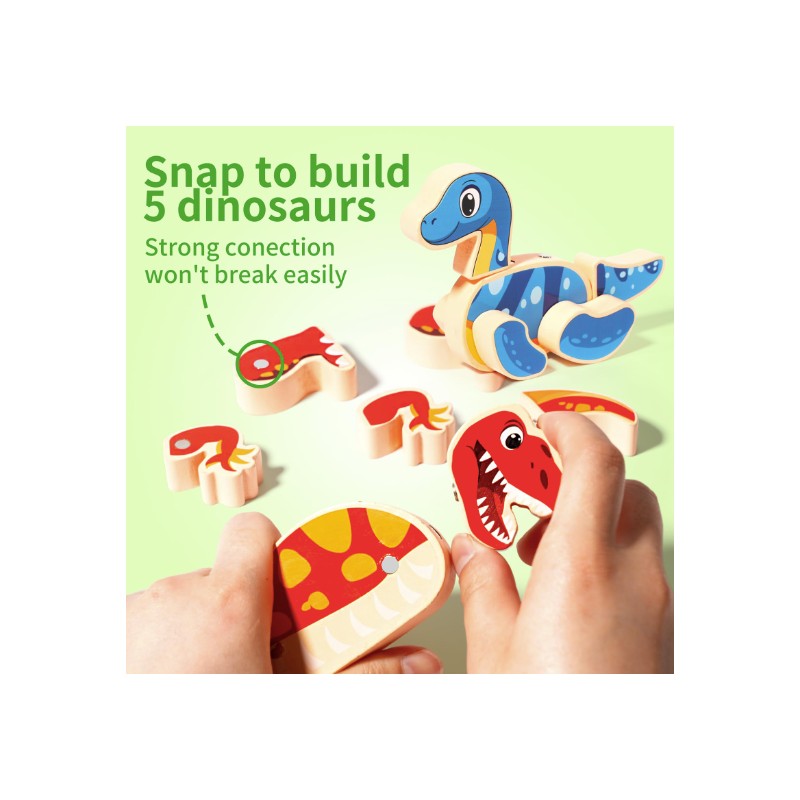 Create Five Prehistoric Dino: This Playset comes with 37 wooden pieces designed for open-ended dinosaur construction. Kids can use these color-coded snap-together heads, legs, tails and more to create 5 different dinosaurs, also kids can use their imagination to mix and match these builders to create some cool creatures!