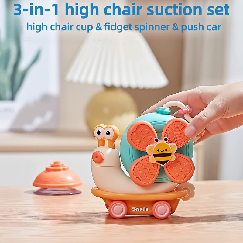 - 🎀【Montessori with multiple ways to play】Cute snail design high chair toys, put the windmill on a suction cup and you get a suction toy that can be attached to windows and bathrooms. The head and gears of the spinning snail make a squeaking sound and the slicing sound when your baby shakes it makes it a baby rattle, combined they make a complete snail back car.