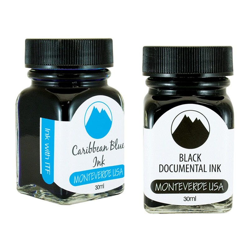 - Pack Contains the following Monteverde USA Ink Bottles: (1) Monteverde 30ml Caribbean Blue Ink Bottle. (1) Monteverde 30ml Black Documental Ink Bottle.