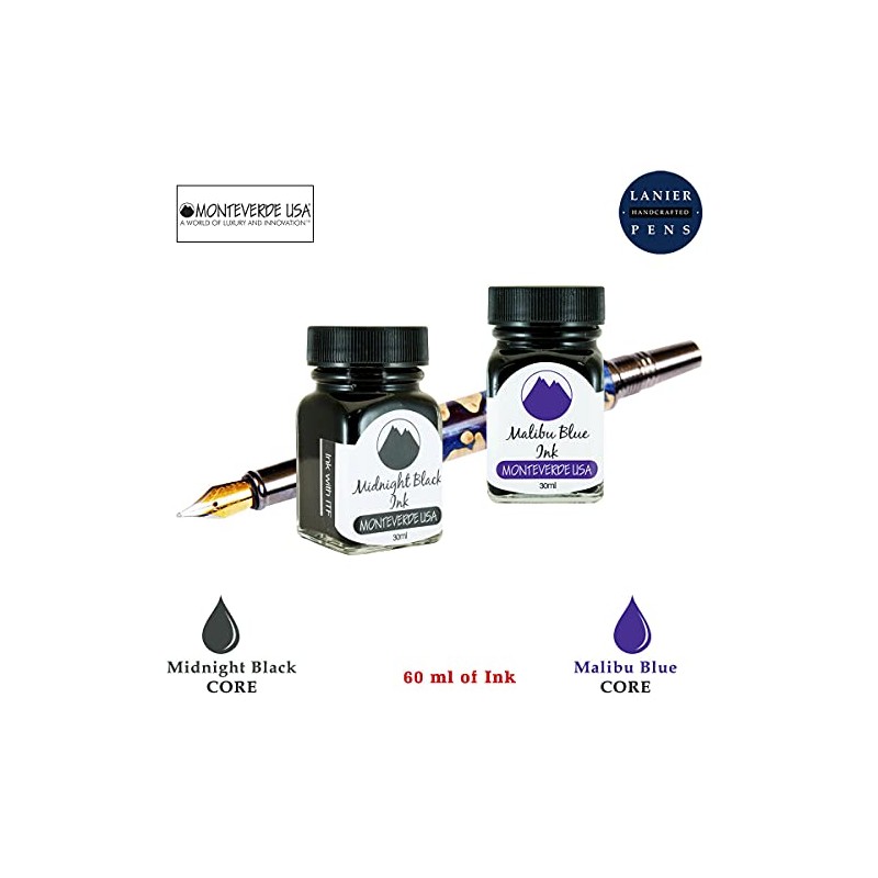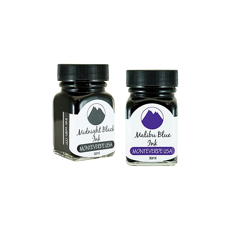 - Pack Contains the following Monteverde USA Ink Bottles: (1) Monteverde 30ml Midnight Black Ink Bottle. (1) Monteverde 30ml Malibu Blue Ink Bottle.