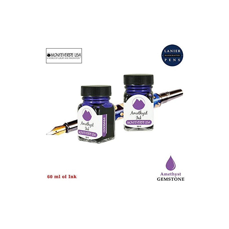 - Item Dimensions (L x W x H): 1.37 x 1.34 x 2.44 inches (each). Item Weight: 3.3 ounces (94 grams) (each). Material: Glass. Color: Amethyst. 60ml Ink Bottle (Gemstone - 30ml Amethyst Ink Bottle - Pack of 2). Brand: Monteverde. Model Number: G309AM. Manufacturer Part Number: G309AM.