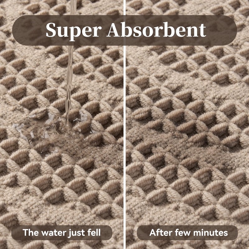 - Super Absorbent: Bath mat absorbs water quickly with unique waffle weave texture, make your feet stay dry. Bathroom floor mat keeps your feet away from cold floors. Bathroom rugs with breathable grooved construction are dry faster and keep your bathroom dry and fresh.