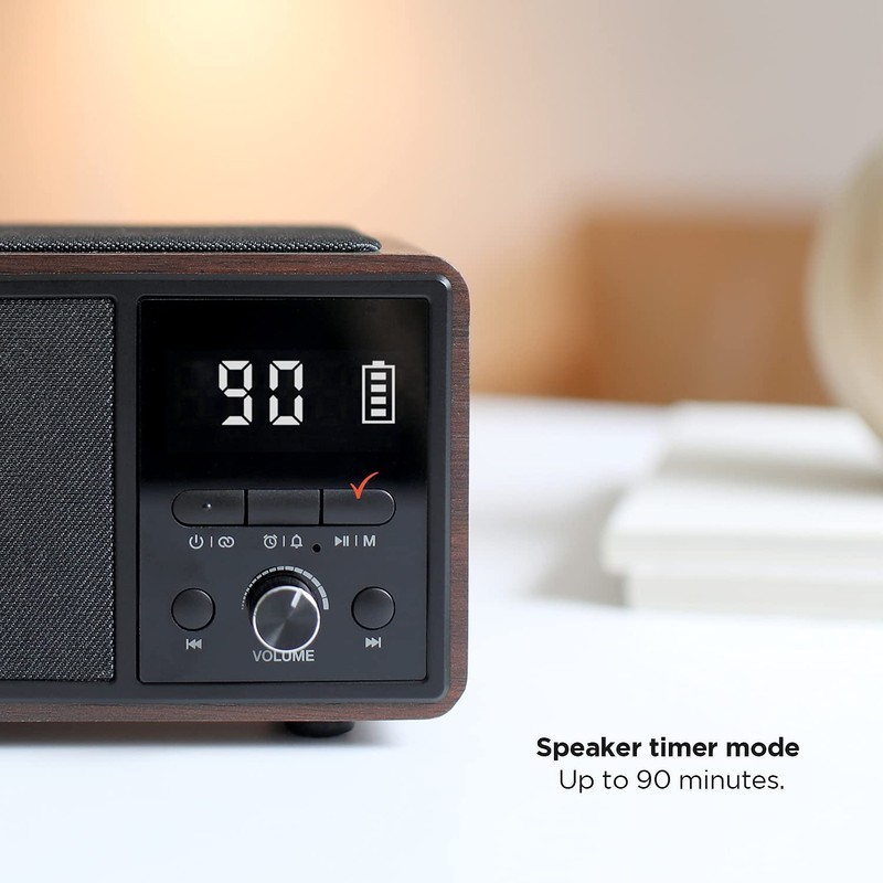 • Alarm and snooze: Supports alarm and snooze. The alarm sound can be chosen from the default alarm in the speaker, last song played on the TF card or FM radio. The snooze can be set in 9-minute intervals and there are no limits to number of snoozes.