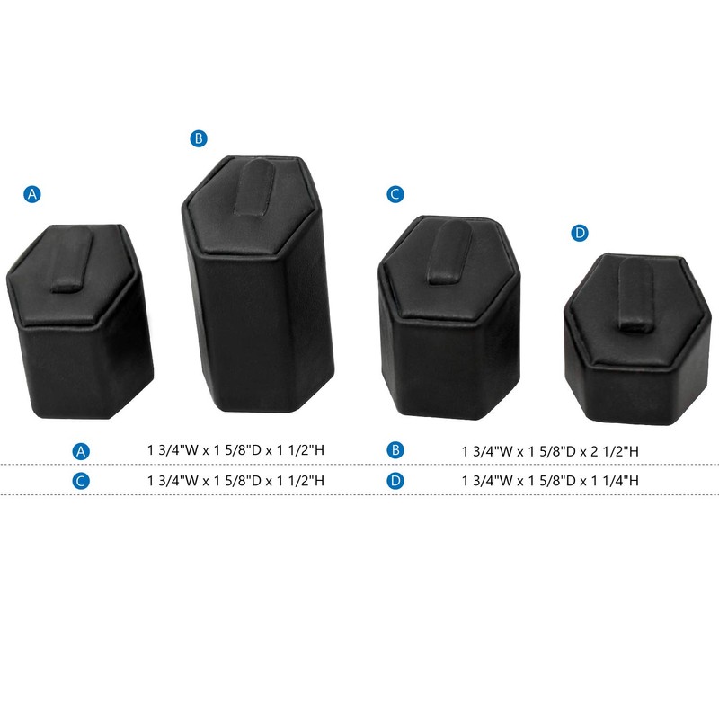 This 4 piece ring pedestal display set is covered in black faux leather with a metal ring clip. Height of 4 pedestal displays from 1 1/4”H to 2 1/2”H. Each stand can hold a single ring. Place your ring under tab to keep ring upright and secure for showcasing. Perfect for retail stores, trade shows or personal use, this ring holder set includes 4 pieces of stands with different heights for displaying your jewelry to be attractive and beautiful.