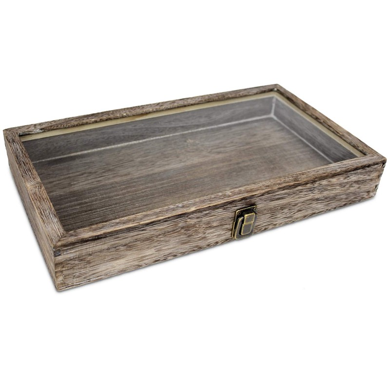 Designed to help showcase and portray items so they can stand out, this wooden case has an empty compartment for you to freely customize your storage! It has a glass top lid and a metal latch in the front to keep your collection safe in place and easily to see your items clearly.