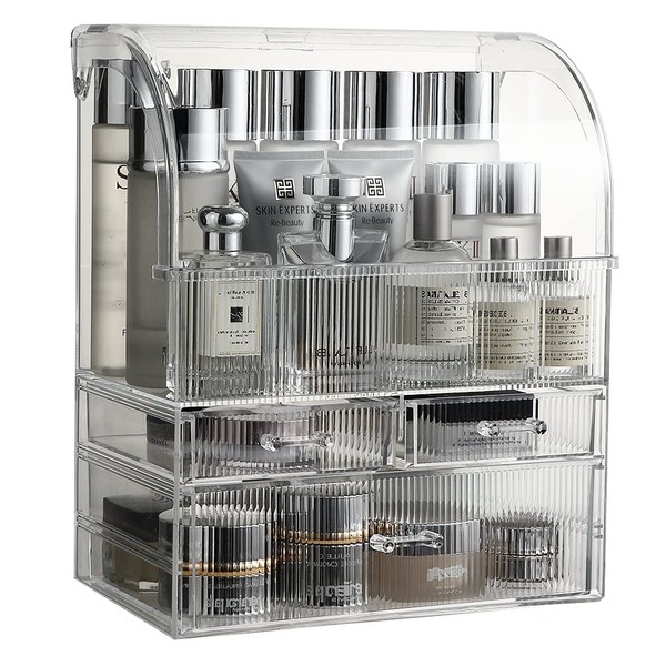 - LARGE ACRYLIC COSMETIC STORAGE - One piece handhelder drawers: height 3.2inch for all kinds face creams, heights 1.4inch for masks, power, lipsticks; the top with 8.7inch available heights can hold several essensial bottles.