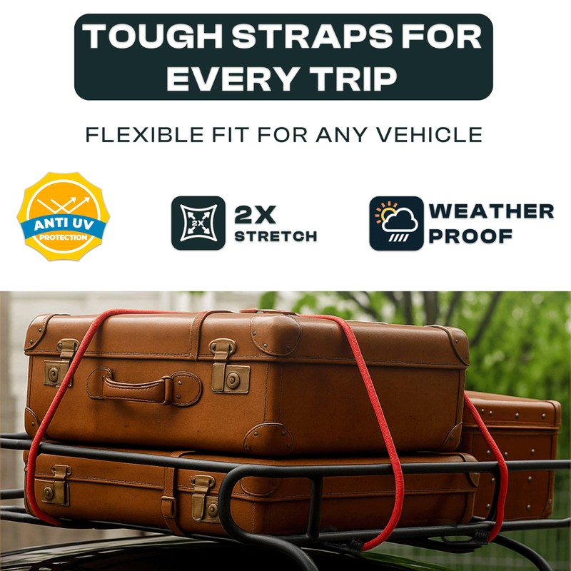 • Heavy Duty Bungee Cords:Built with premium flat rubber and a cross-woven core, our bungees with hooks deliver exceptional strength and gives 2x elasticity. Each bungee straps are anti-UV resistant and double-braided to endure harsh sun, rain, and extreme weather.