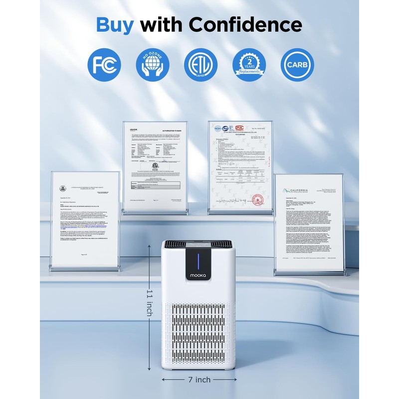 • Quality Assurance & Worry-Less Service : CARB/CE/FCC/RoHS/DOE certified and ETL listed(Available for California). Our HEPA air purifier for bedroom does not produce trace amounts of ozone and is environmentally friendly. We provide our customers with a 1-year replacement. PS: Purchase MOOKA official replacement filter on Amazon by searching for B0D3FYKQ6B
