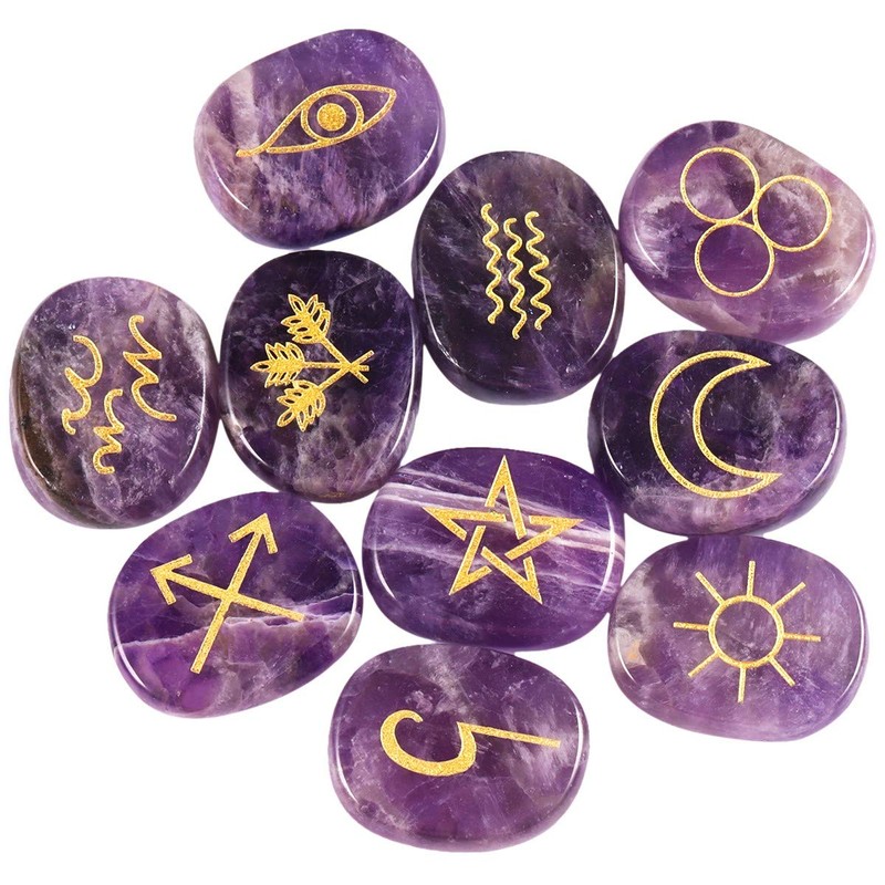 mookaitedecor Amethyst Witches Runes Set,Healing Crystal Palm Stone Engraved Gypsy Symbol for Meditation Divination