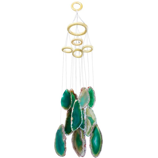 - Stylish wind chime for indoor and outdoor decor, 12 strands with green agate geode slices. Overalll length: approx 20-23 inches, Dangle agate slices are 2.4-5.5 inches in diameter. Hanging ring size is 1 inches in diameter; Weights about 270-470 gram for each wind chime. Each agate slice is an original slight variations in color and shape are the nature of handcrafted craft.