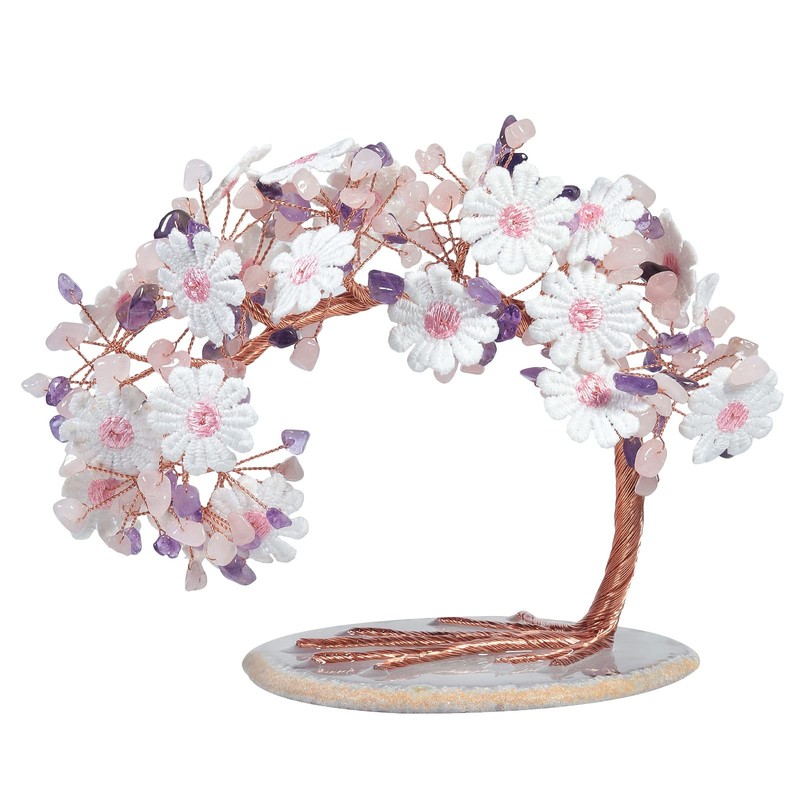 - Eternal Flower Crystal Tree: The artificial flower design is beautiful and made of lace, to meet the needs of for you who like decorations full of art, a unique decorative crystal tree. Natural crystal chip stones as leaves, and the branches and trunks are made of flexible copper wire wrapped on natural geode slice base, you can create you special stone tree with your imagination and creativity.
