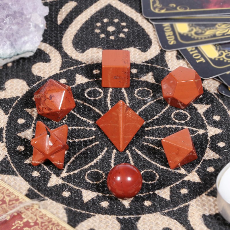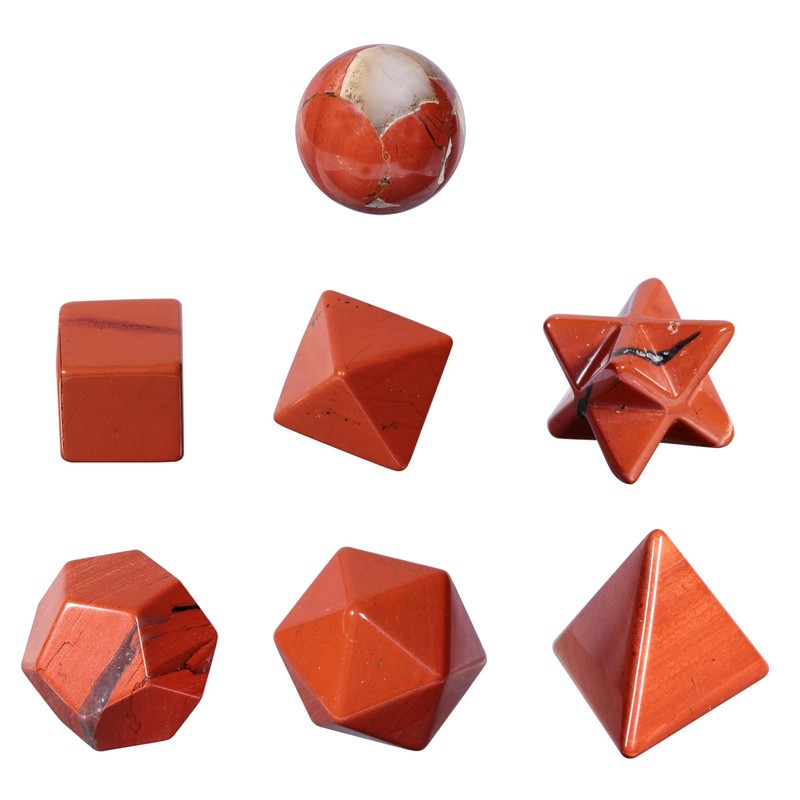 - 『7 Pcs Sacred Geometry Crystal Set』Made of natural Red Jasper, polished and smooth. Package included 5pcs Platonic Solids Set, 2pcs mysterious crystals, 1pc chakra gift box, 1pc branded storing pouch. Natural healing crystals set for meditation, spiritual practices, Wiccan decors, spiritual gifts for women, etc.