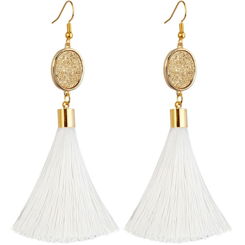 • Detail of Tassel Earrings -- Total length approx 3.6-4" (92mm-102mm); Bead size approx 0.7x0.5x0.1" (18x14x4mm);Tassel length approx 2" (50mm-60mm); Color: Golden Druzy & White Tassel;Package included 1 pair of hook earring and 1 gift bag;