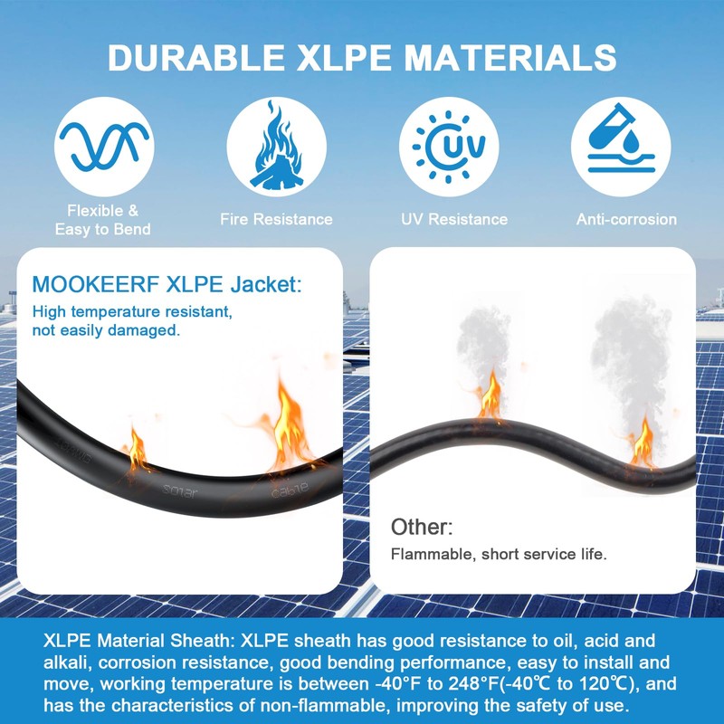 - [Double Insulation XLPE Material, Extreme Durability & Safety]: Built to withstand harsh outdoor environments, our solar cable features superior XLPE (Cross-Linked Polyethylene) insulation. XLPE offers excellent resistance to sunlight (UV), can withstand the temperature range of -40°F to 248°F (-40℃ to 120℃), rated voltage 1800V DC, abrasion, chemicals, and moisture, ensuring long-lasting performance and safety for your solar panel cable connections.
